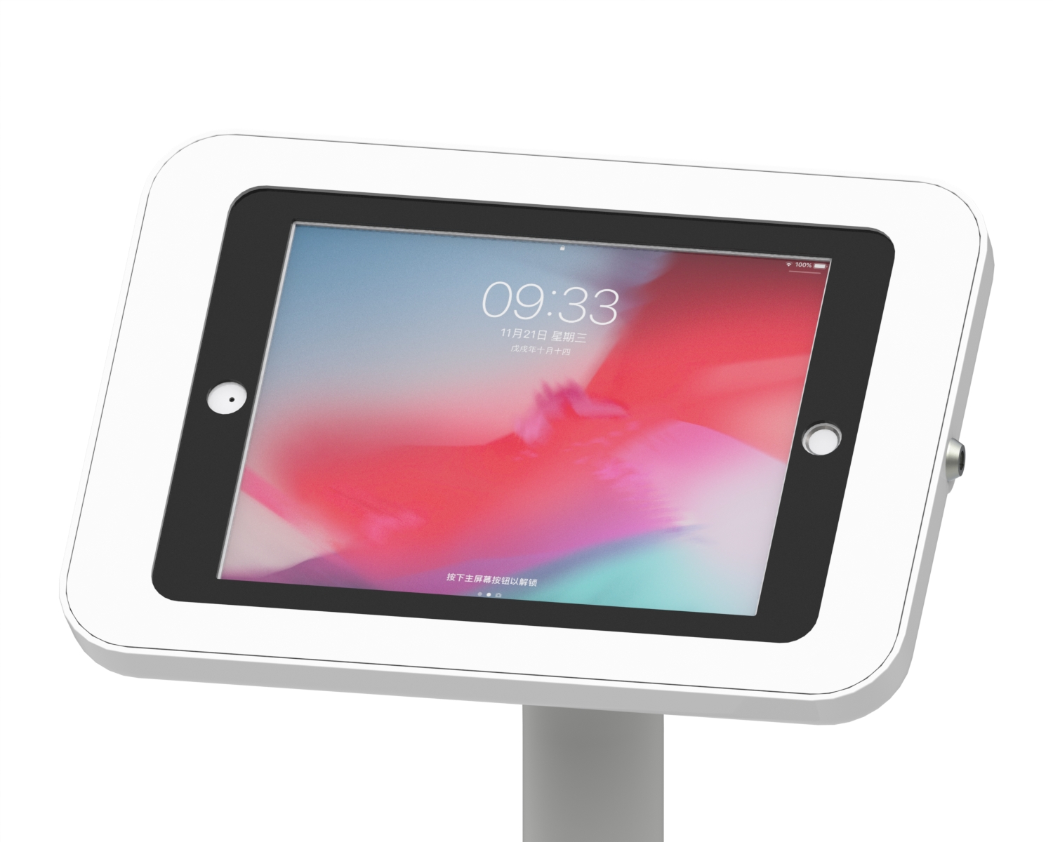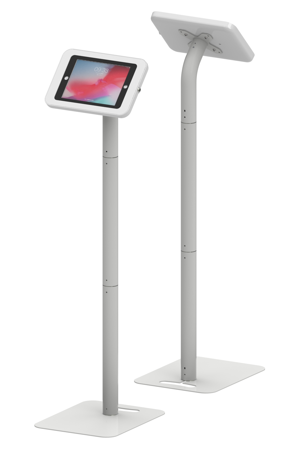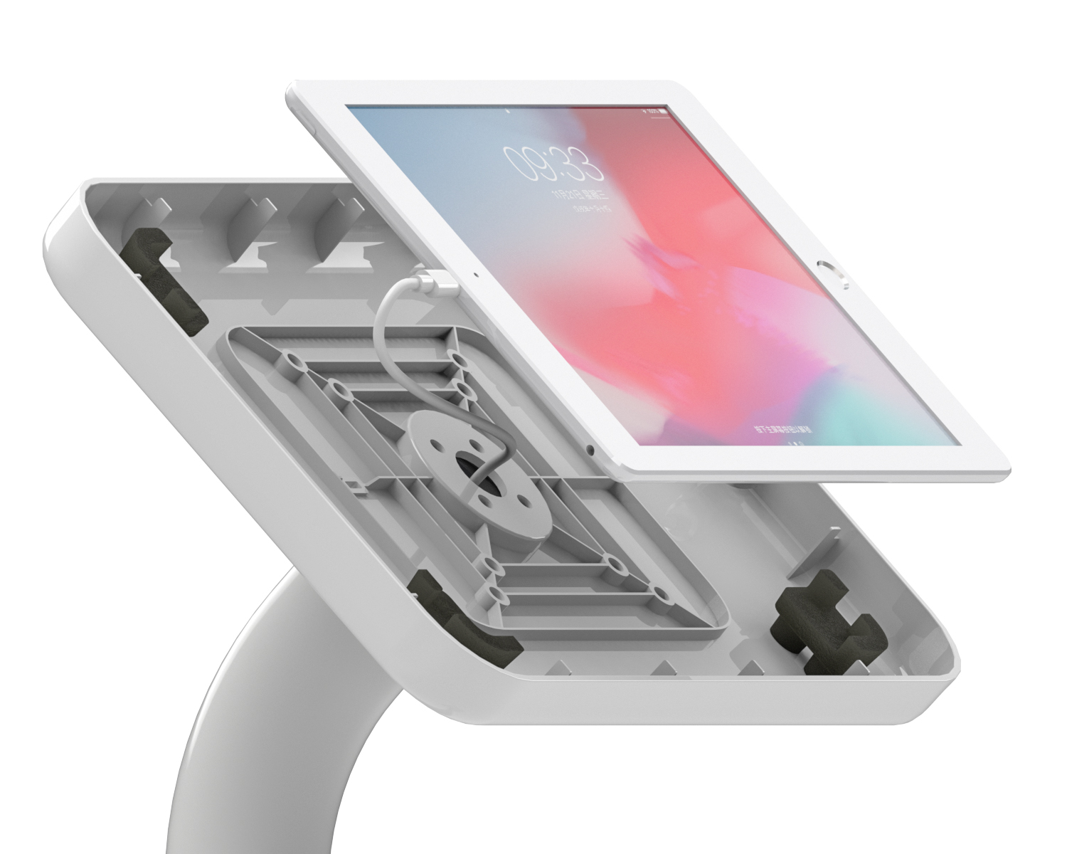 Curve Pro Series is a floor standing secure tablet kiosk stand features a gracefully curved neck with a streamline beautiful design ABS & metal tablet enclosure. 3 Section design transforms to lower version or countertop use simply. Knock down design allows a very small package thus easy to transport. The lightweight, rugged and easy to set up floor tablet display stand is ideal for shop, showroom, event and tradeshows.