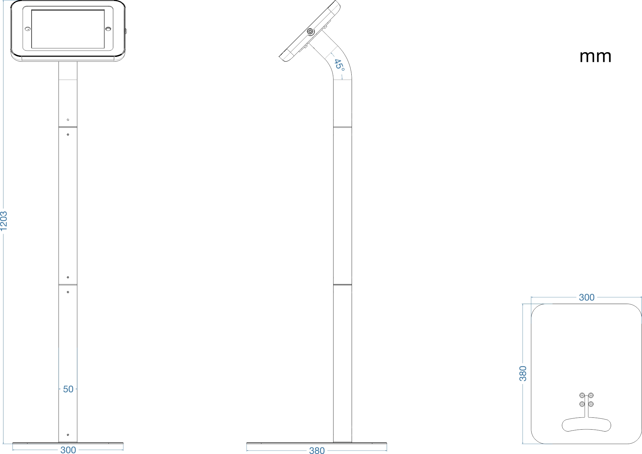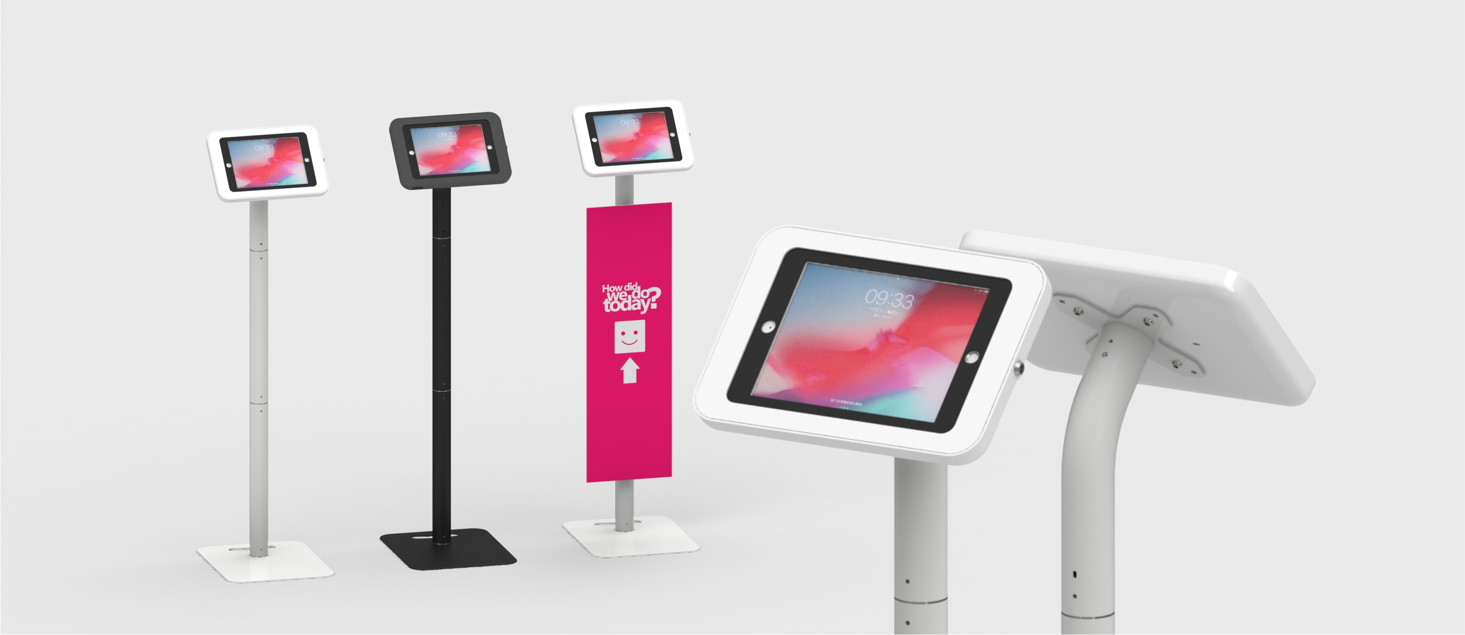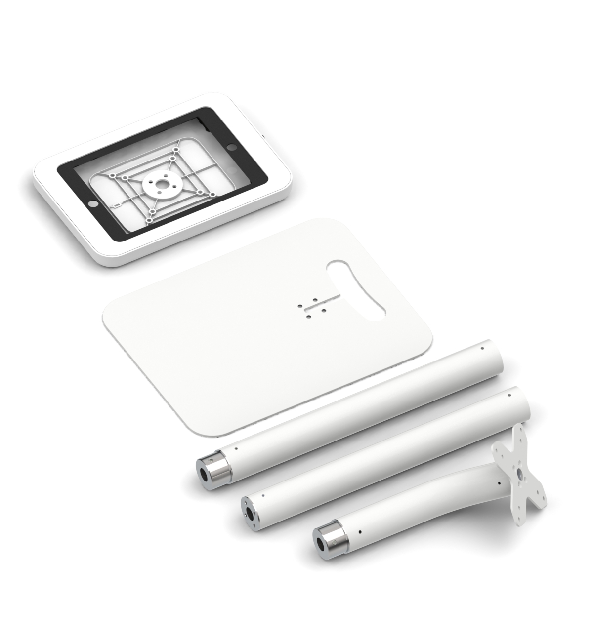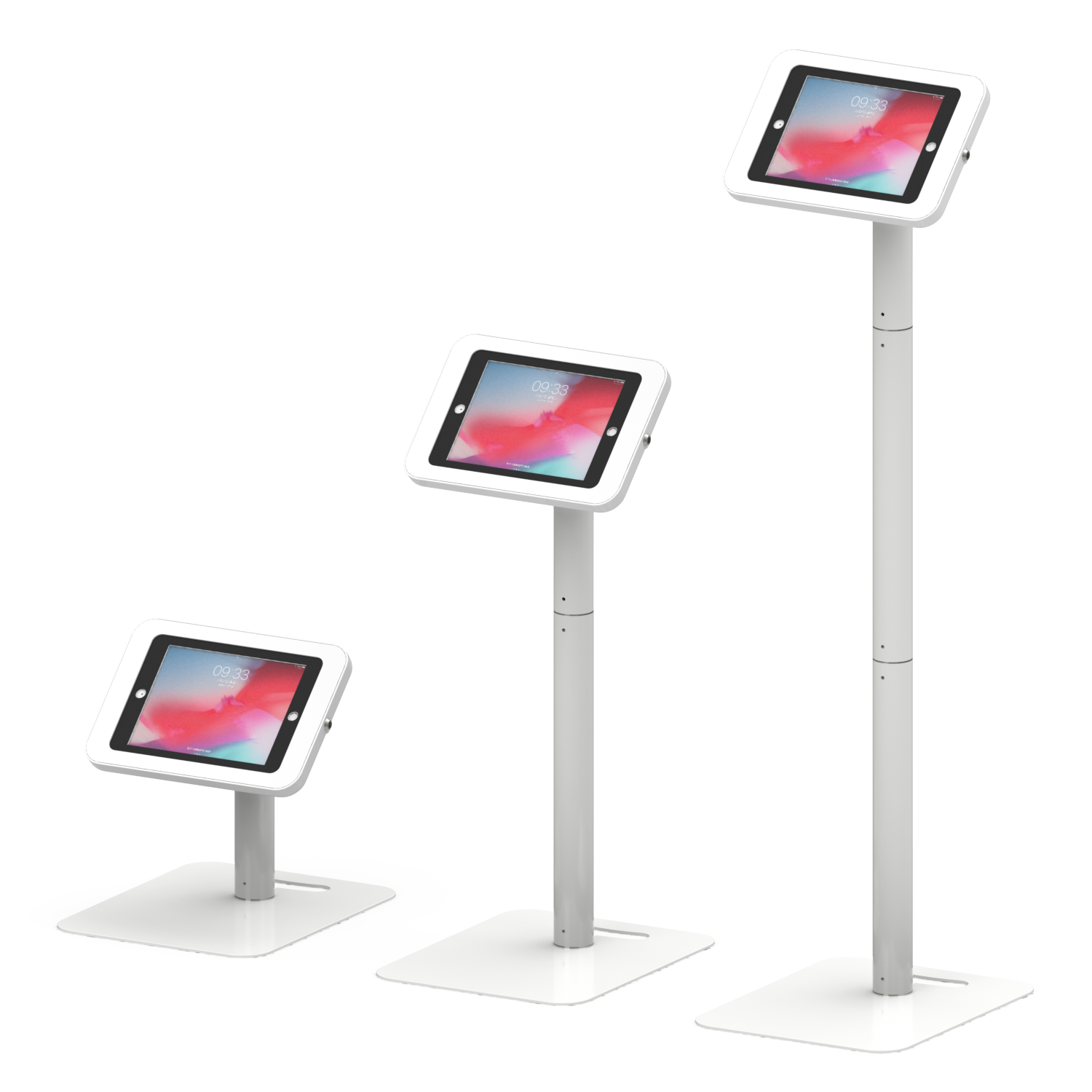 Curve Pro Series is a floor standing secure tablet kiosk stand features a gracefully curved neck with a streamline beautiful design ABS & metal tablet enclosure. 3 Section design transforms to lower version or countertop use simply. Knock down design allows a very small package thus easy to transport. The lightweight, rugged and easy to set up floor tablet display stand is ideal for shop, showroom, event and tradeshows.