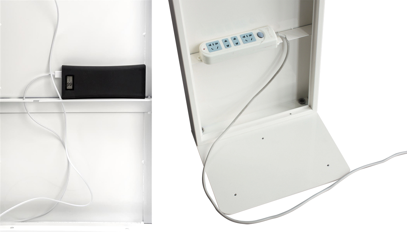 There is room for power socket or power bank in the bottom. So that your tablet can be plugged in the whole time and all within the kiosk. (Power socket or power bank not included)