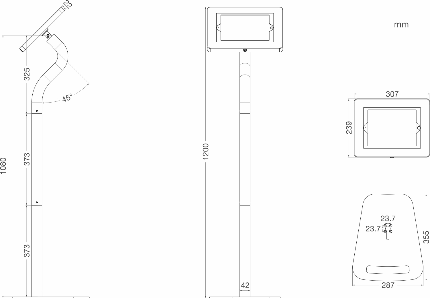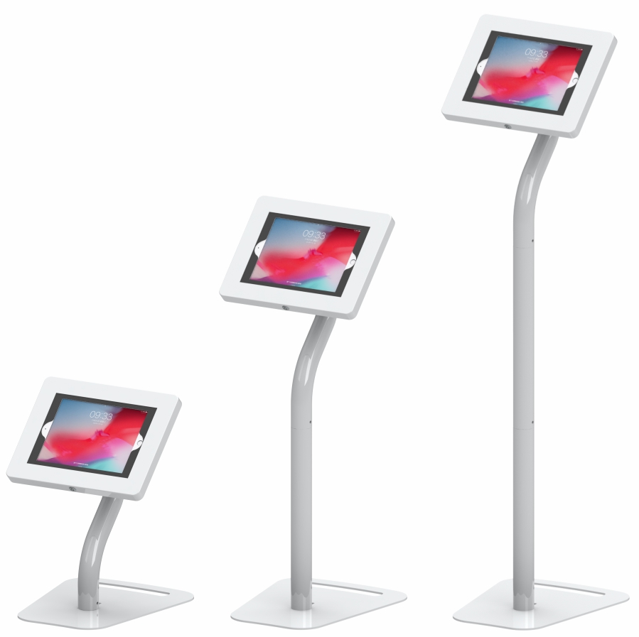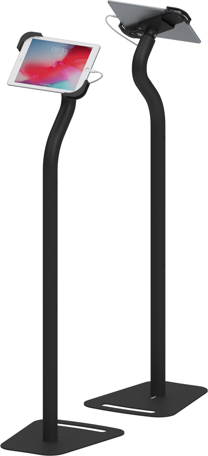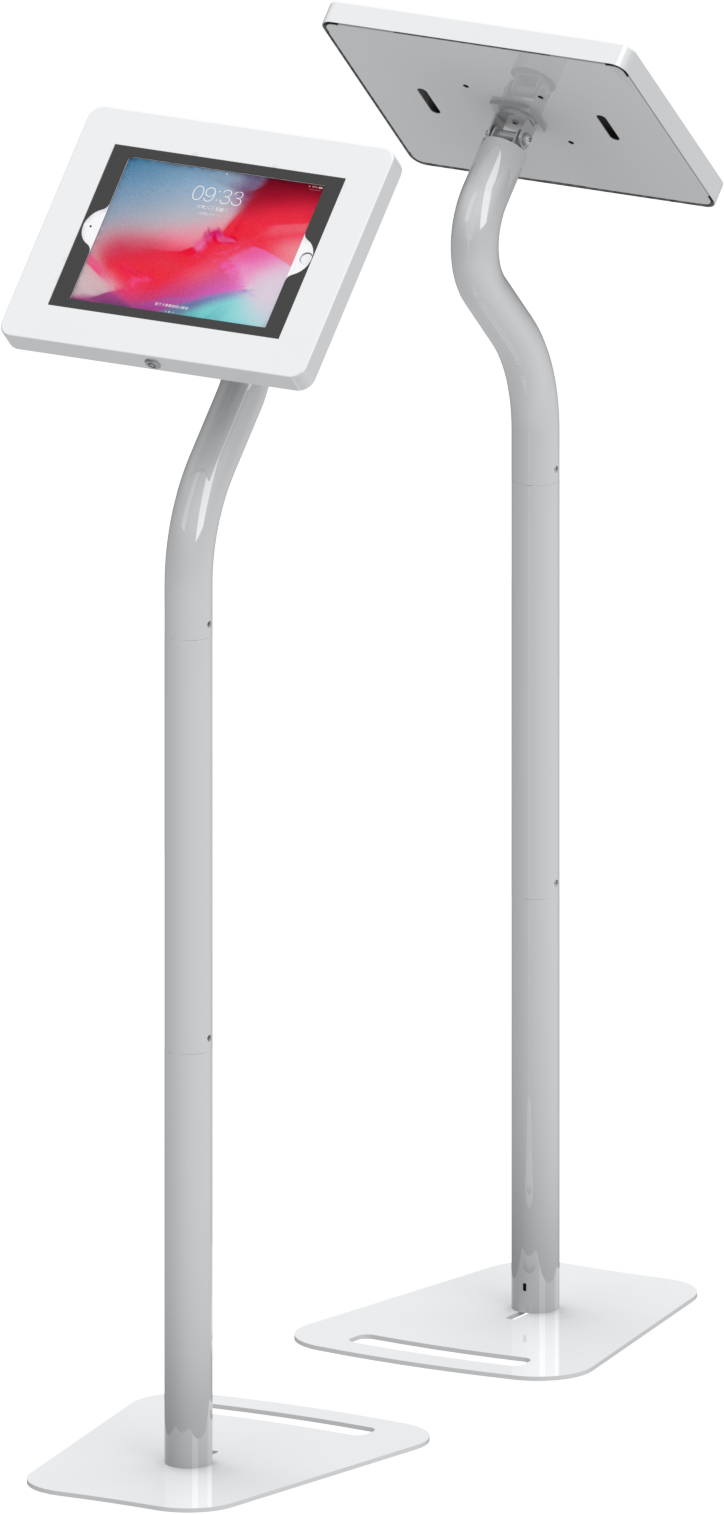 Smart-Swan Series is a floor standing secure tablet kiosk stand features an elegant swan neck and a 3 section pole. The middle pole can be removed to turn the high stand to a lower version to suit sitting or children using situation. Knock down design allows a very small package thus easy to transport.