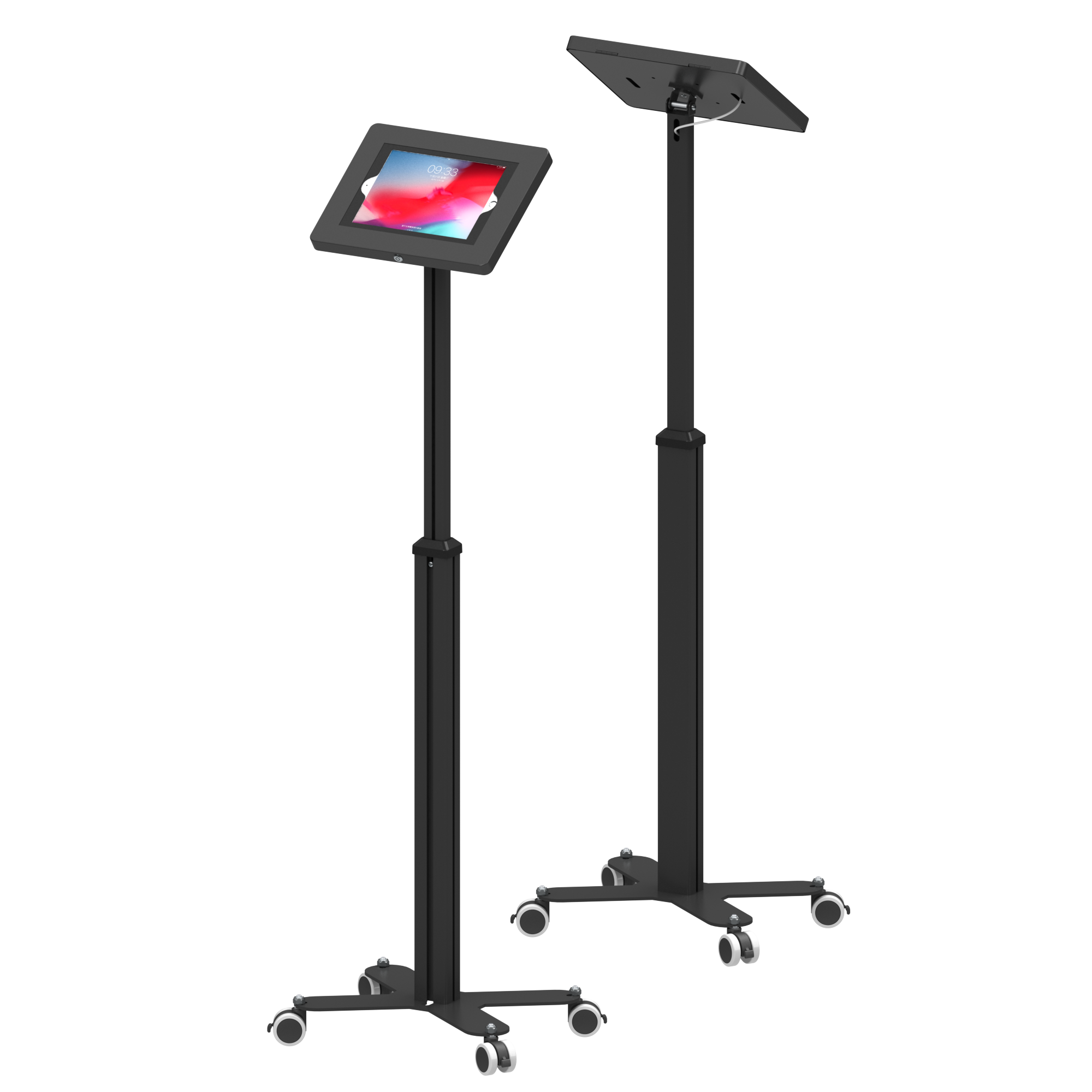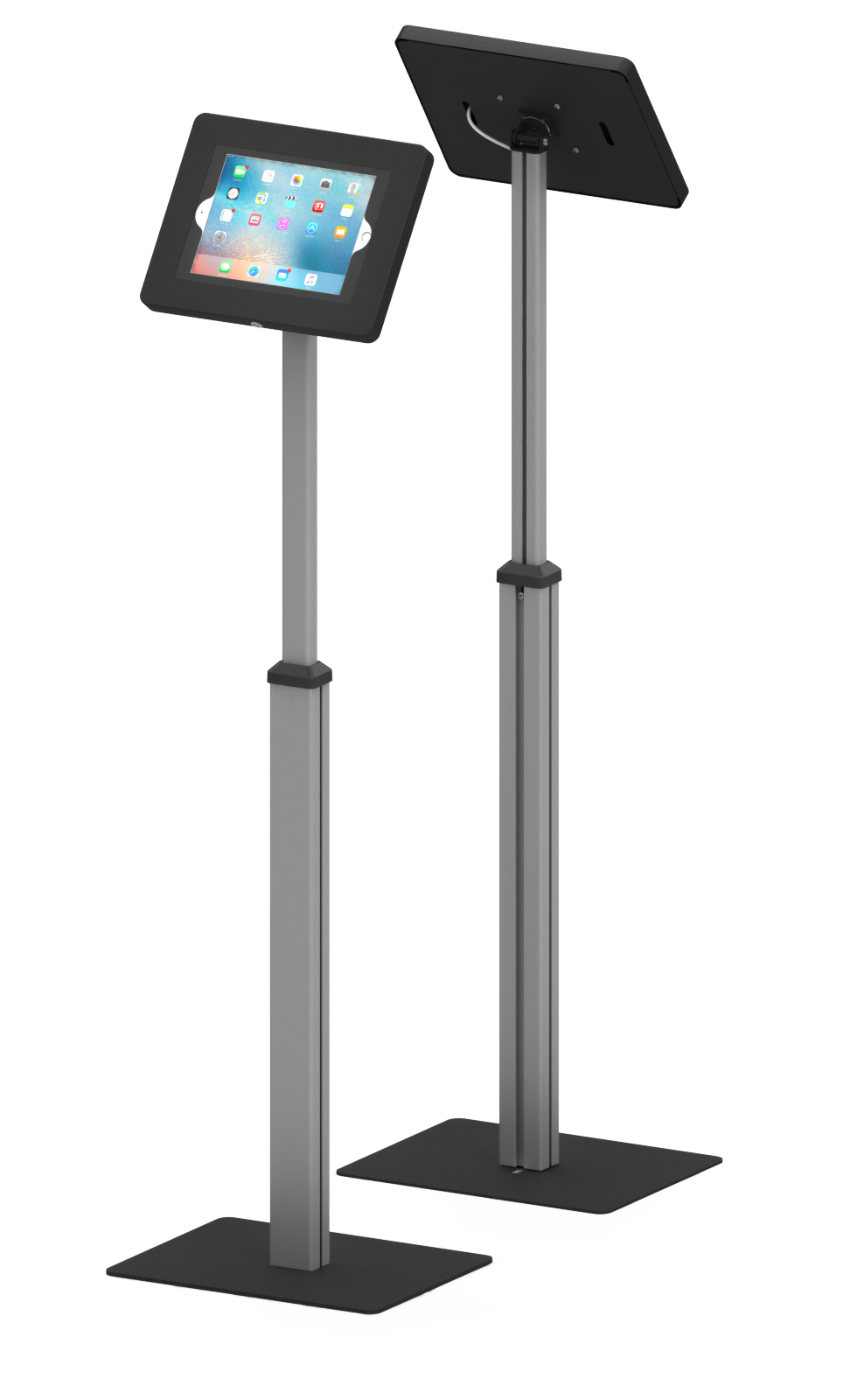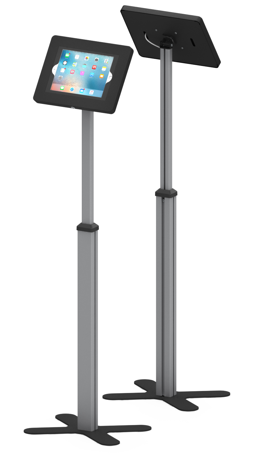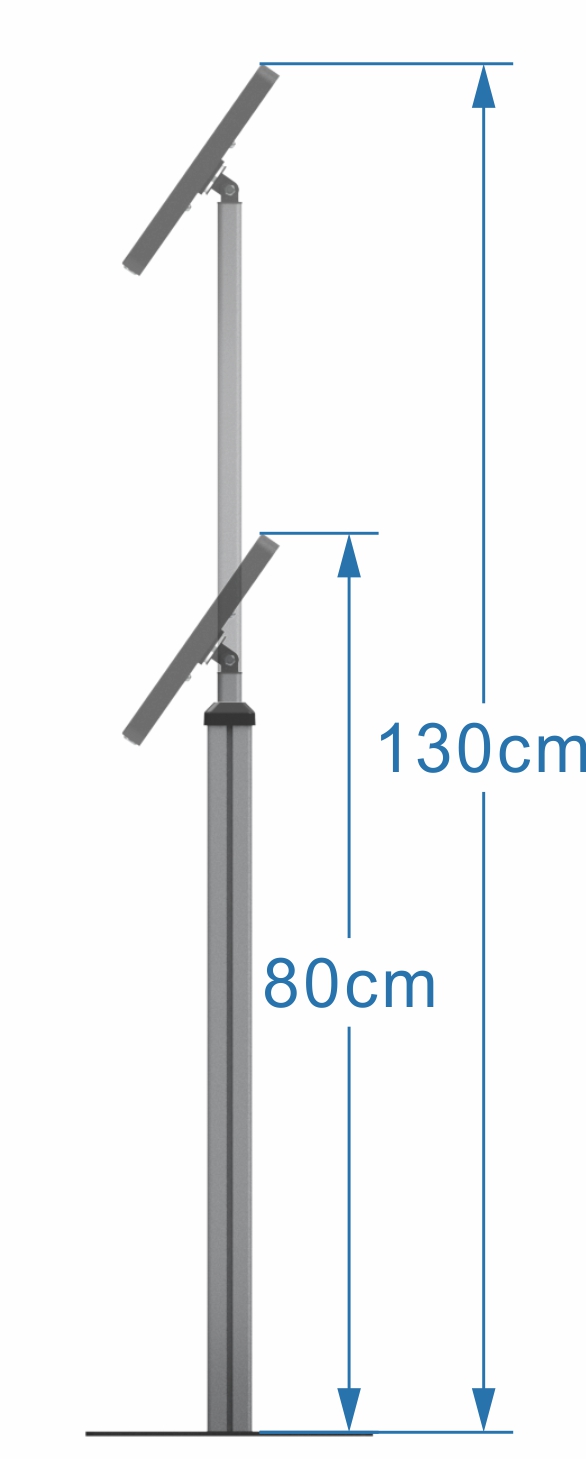 Telescopic Series is a floor standing secure tablet kiosk stand features a height adjustable telesopic pole. Universal enclosure or metal case enclosure choice make it compatible with a Variety of tablet PCS on market. Anodised aluminium tube with sturdy weighted black metal create stylish modern appearance. Easy to set up and adjust height ideal for shop, showroom, event and tradeshows. Design-cross or economy-square 2 different base style choice.