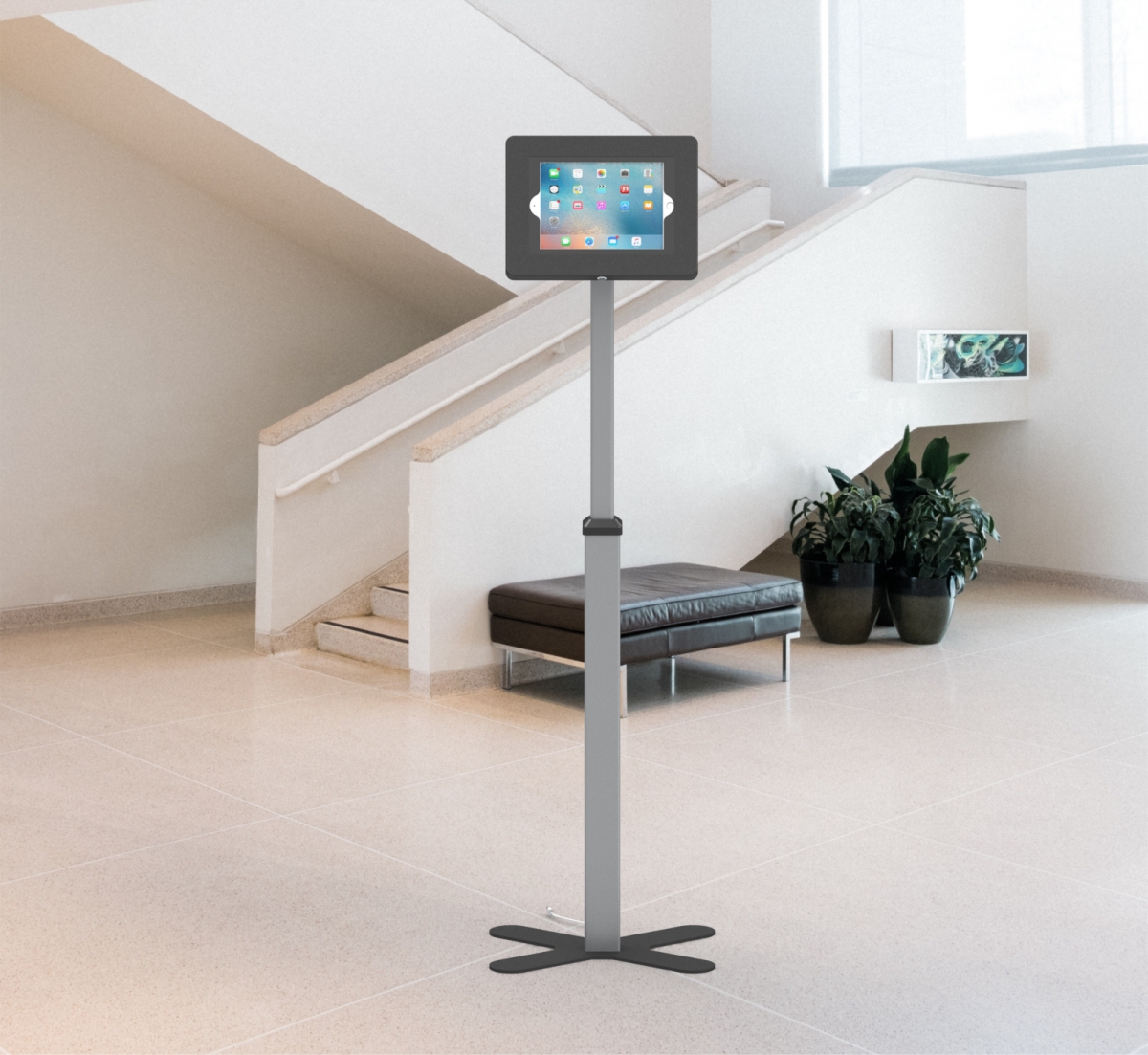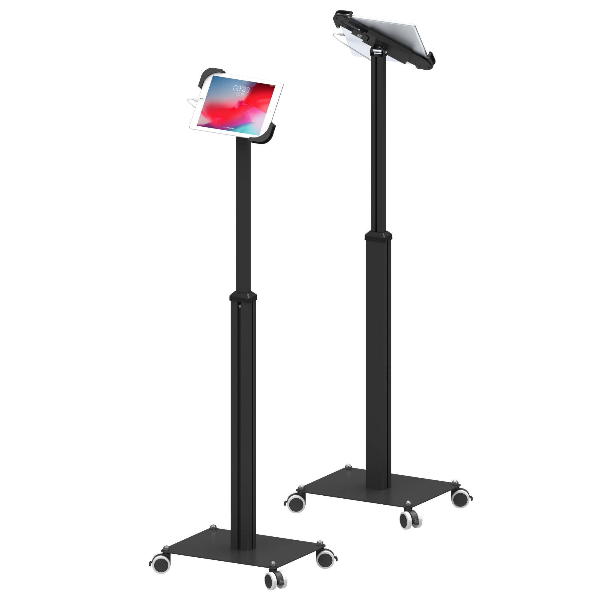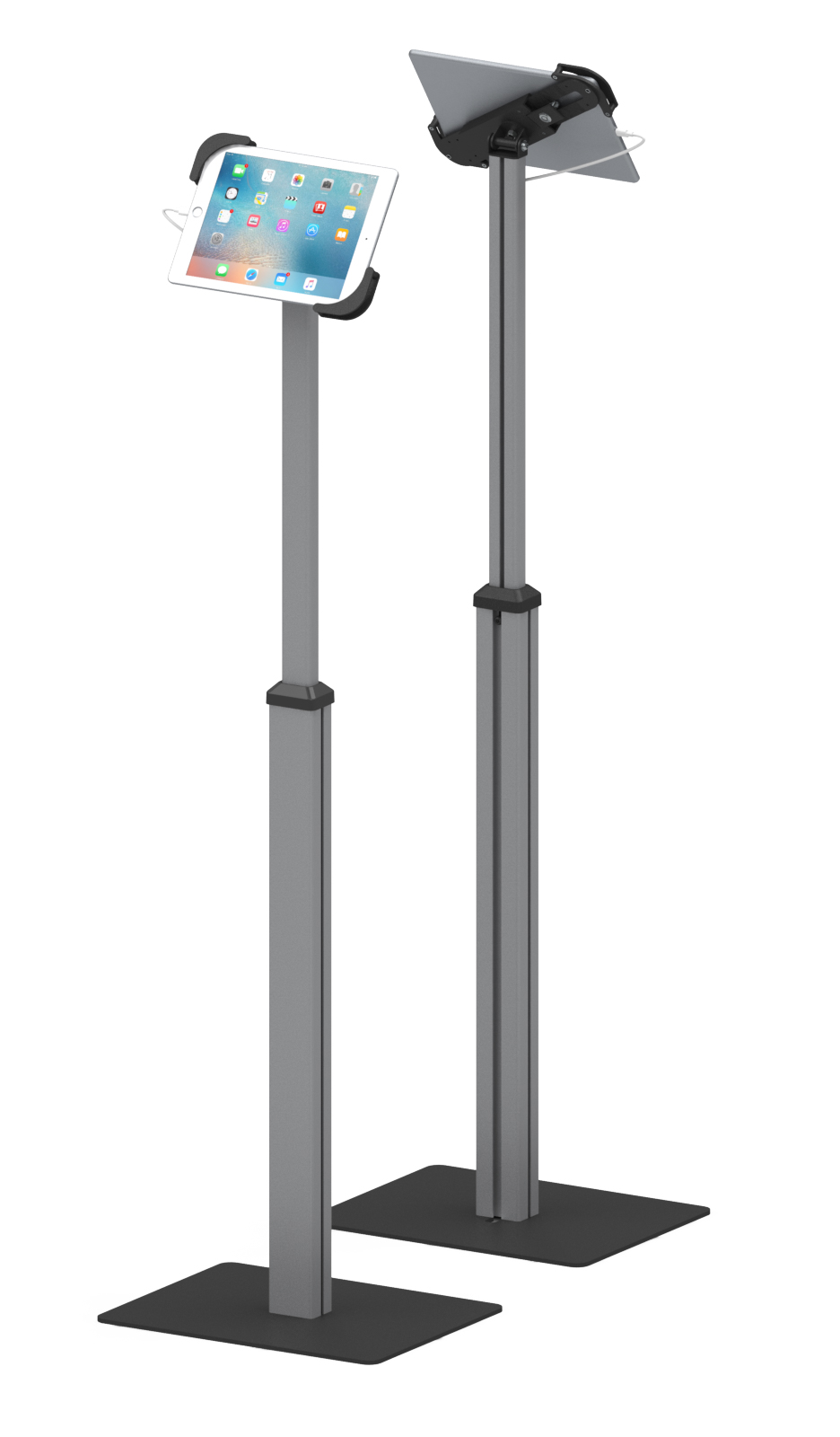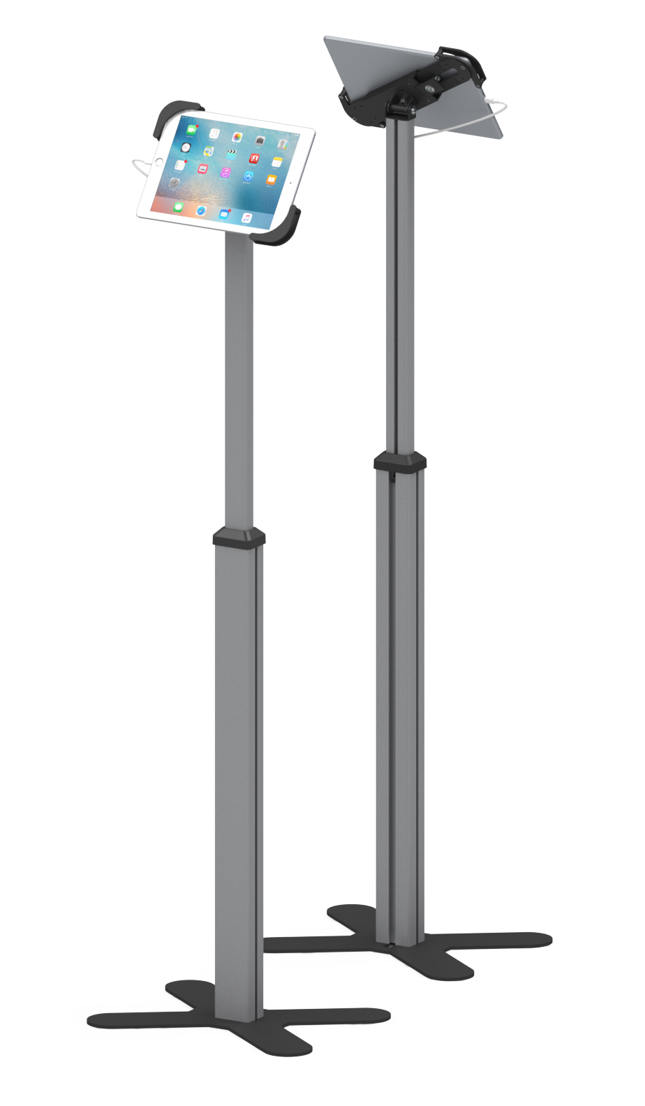 Telescopic Series is a floor standing secure tablet kiosk stand features a height adjustable telesopic pole. Universal enclosure or metal case enclosure choice make it compatible with a Variety of tablet PCS on market. Anodised aluminium tube with sturdy weighted black metal create stylish modern appearance. Easy to set up and adjust height ideal for shop, showroom, event and tradeshows. Design-cross or economy-square 2 different base style choice.