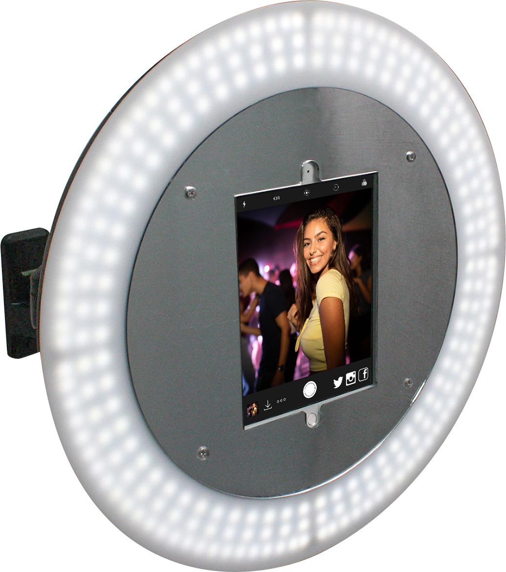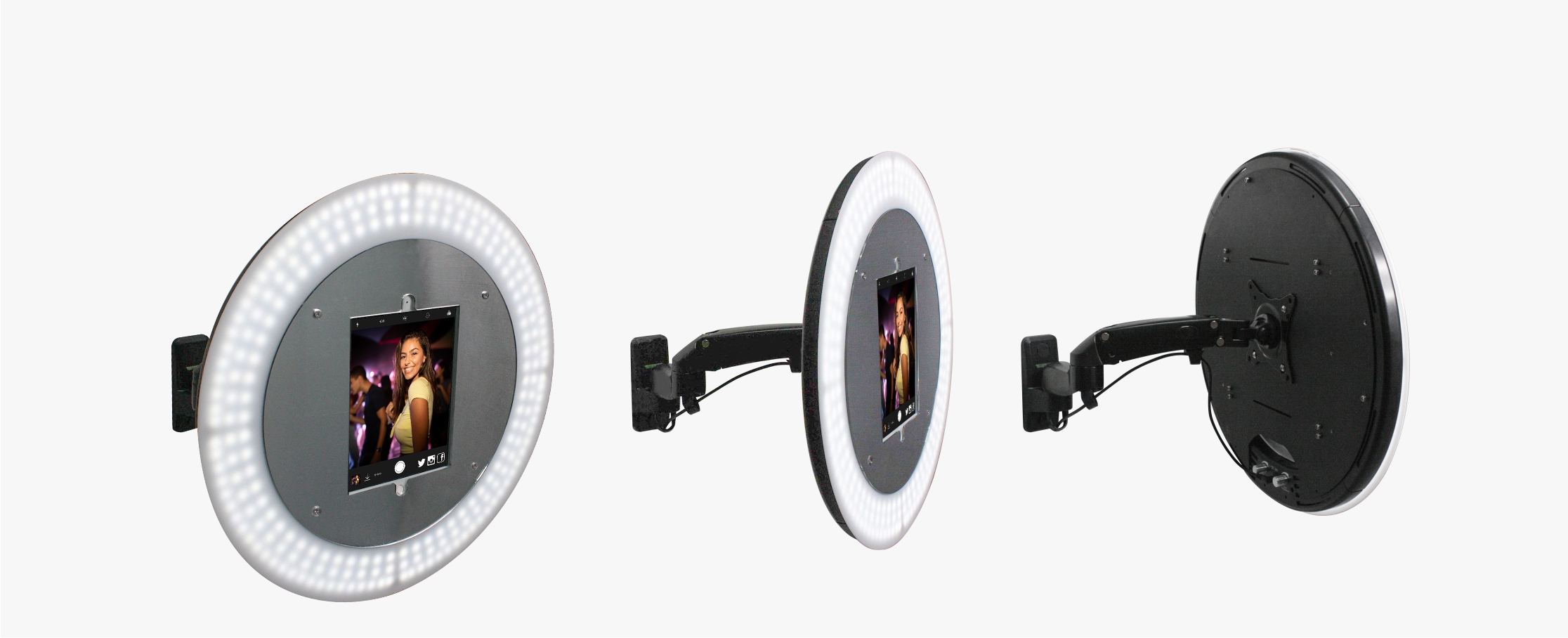Wall mounteded photo booth kiosk features a wall mount balance arm which is angle and height adjustable. The equipped gorgeous dimmable LED ring light is not only light intensity but also light temperature adjustable. It gives super light which satisfies every shot. Ideal for photo booth rental companies, venues, sporting events, corporate events, wedding planners, party planners and more.